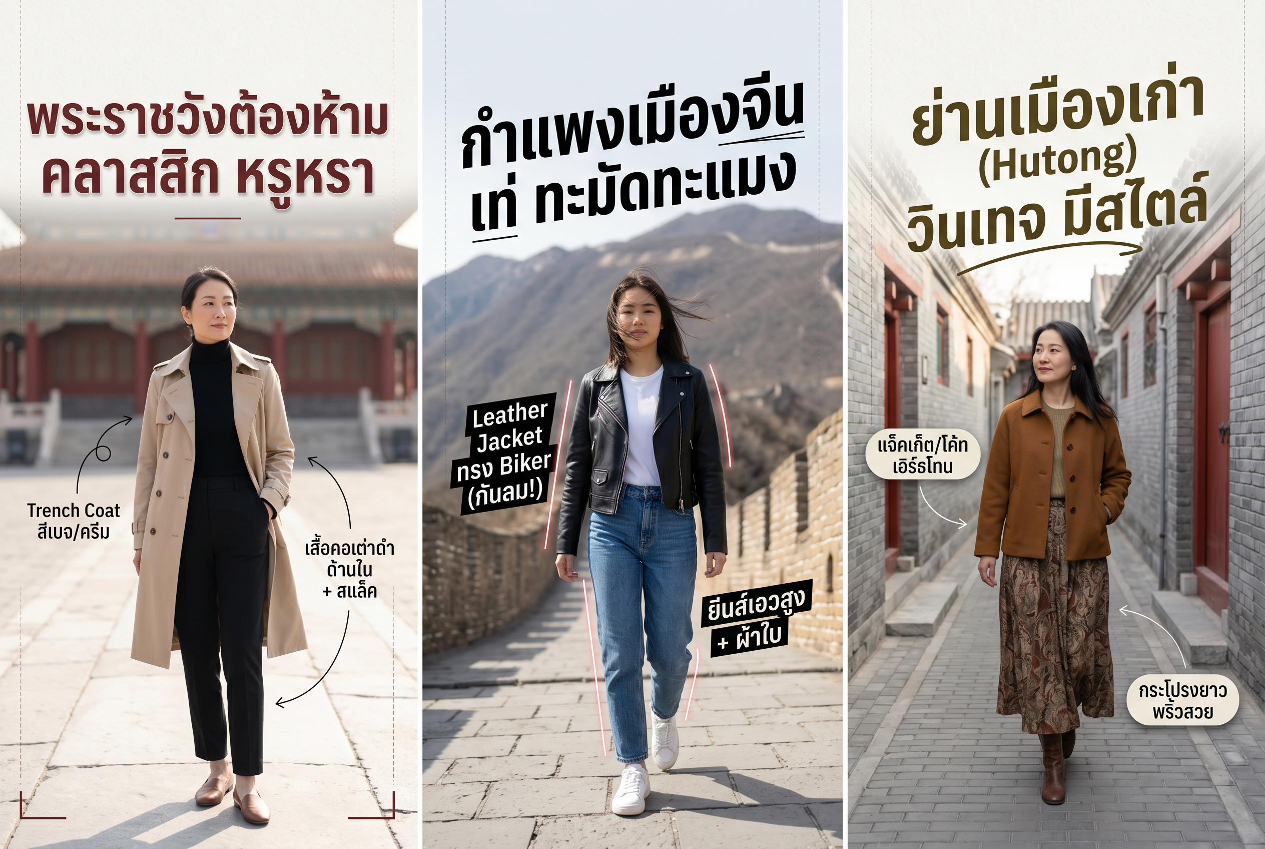 | ย่านเมืองเก่า (Hutong) | วินเทจ มีสไตล์ | เสื้อแจ็คเก็ต หรือ โค้ทเอิร์ธโทน | แมตช์กับกระโปรงยาวหรือกางเกงทรงกระบอก ให้ความอบอุ่นและชิคสุด ๆ |