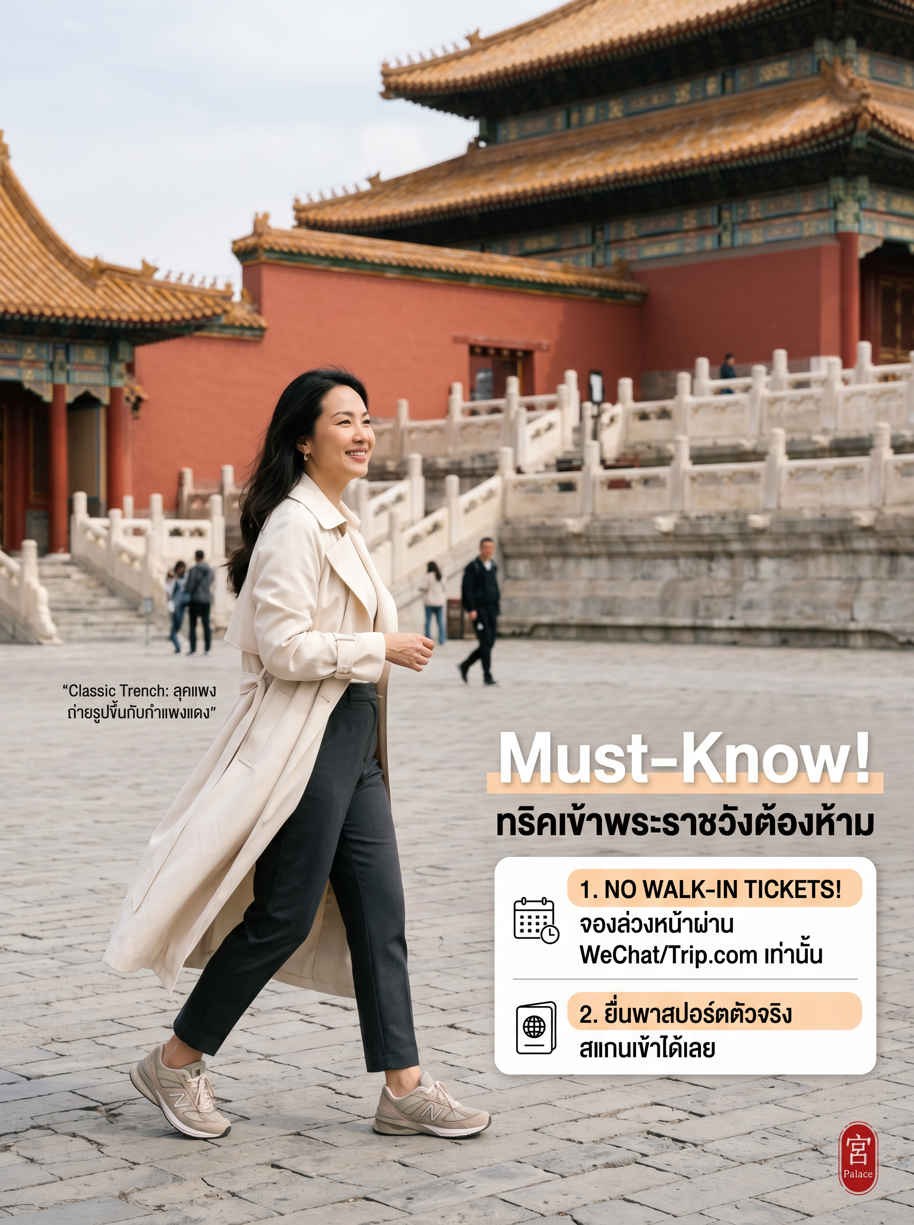 | พระราชวังต้องห้าม | คลาสสิก หรูหรา | โค้ทบาง (Trench Coat) สีเบจ/ครีม | สวมเสื้อคอเต่าสีดำด้านใน แมตช์กับกางเกงสแล็คและรองเท้าคัตชู ได้ลุคที่กลมกลืนกับสถาปัตยกรรม |