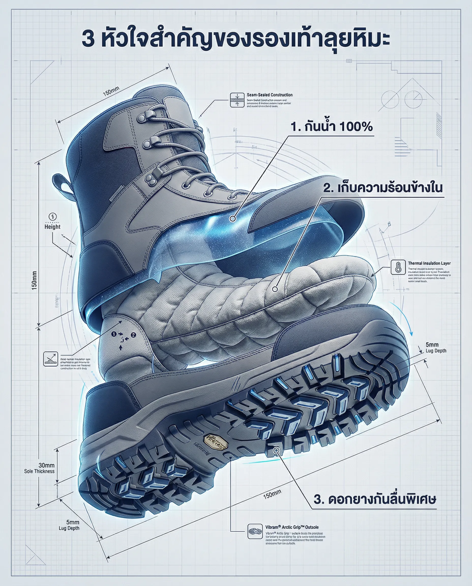 - กันน้ำ (Waterproof) : ต้องกันน้ำได้จริง ไม่ใช่แค่ละอองน้ำ เพราะหิมะคือน้ำแข็งที่พร้อมละลายใส่เท้าคุณตลอดเวลา
