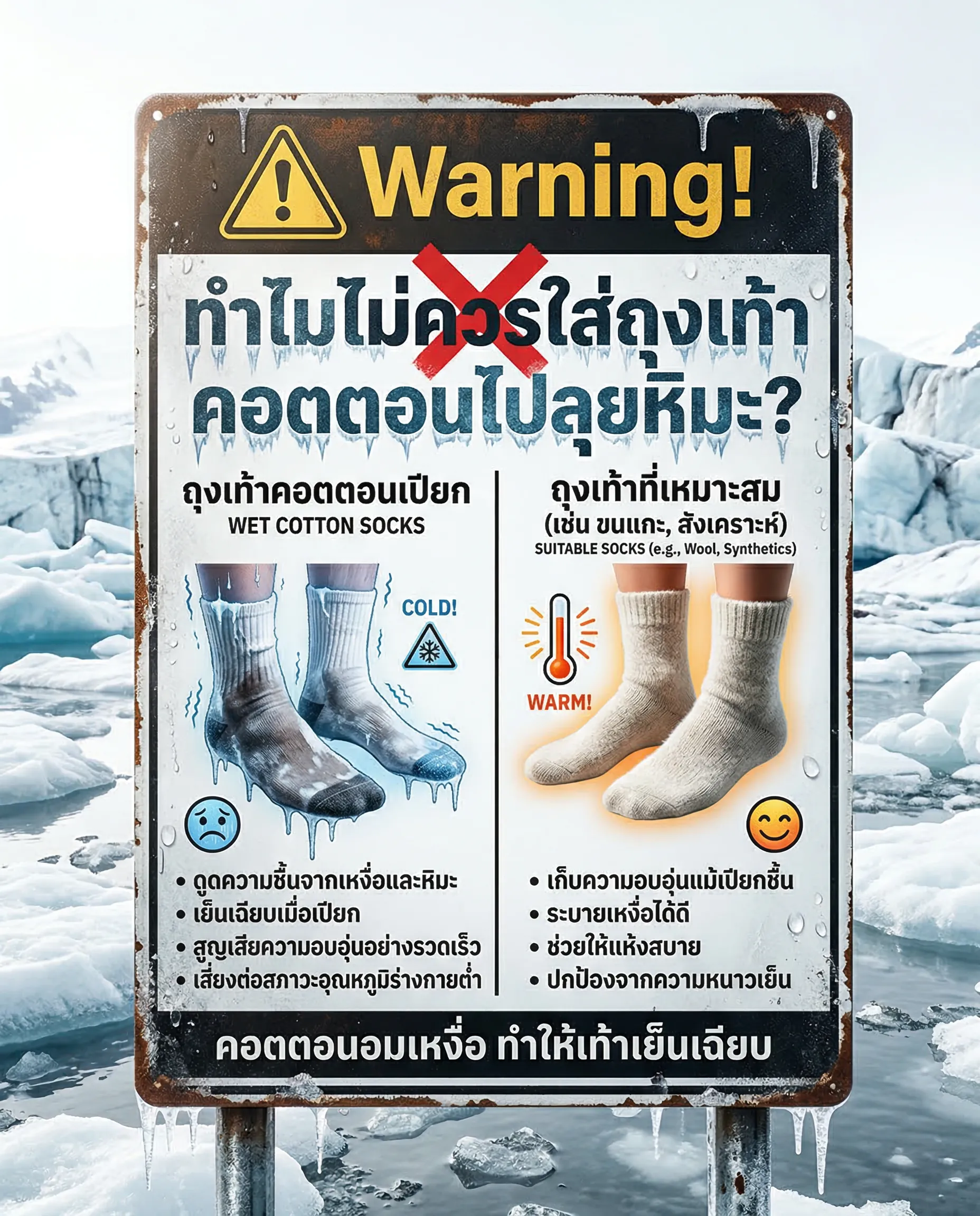- เปรียบเทียบชัด ๆ เพื่อเท้าที่อบอุ่น : ทำไมถึงไม่ควรใส่ถุงเท้าคอตตอนทั่วไปไปลุยอากาศหนาวจัด