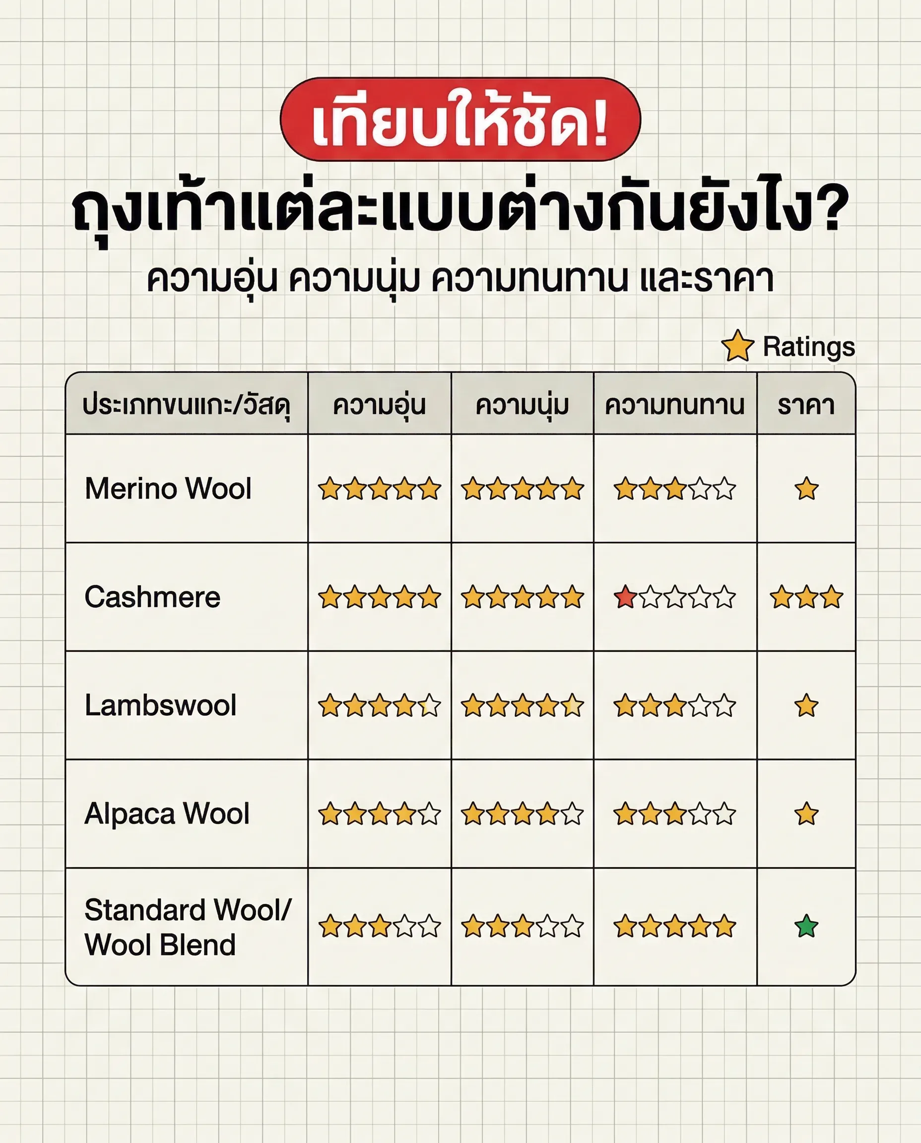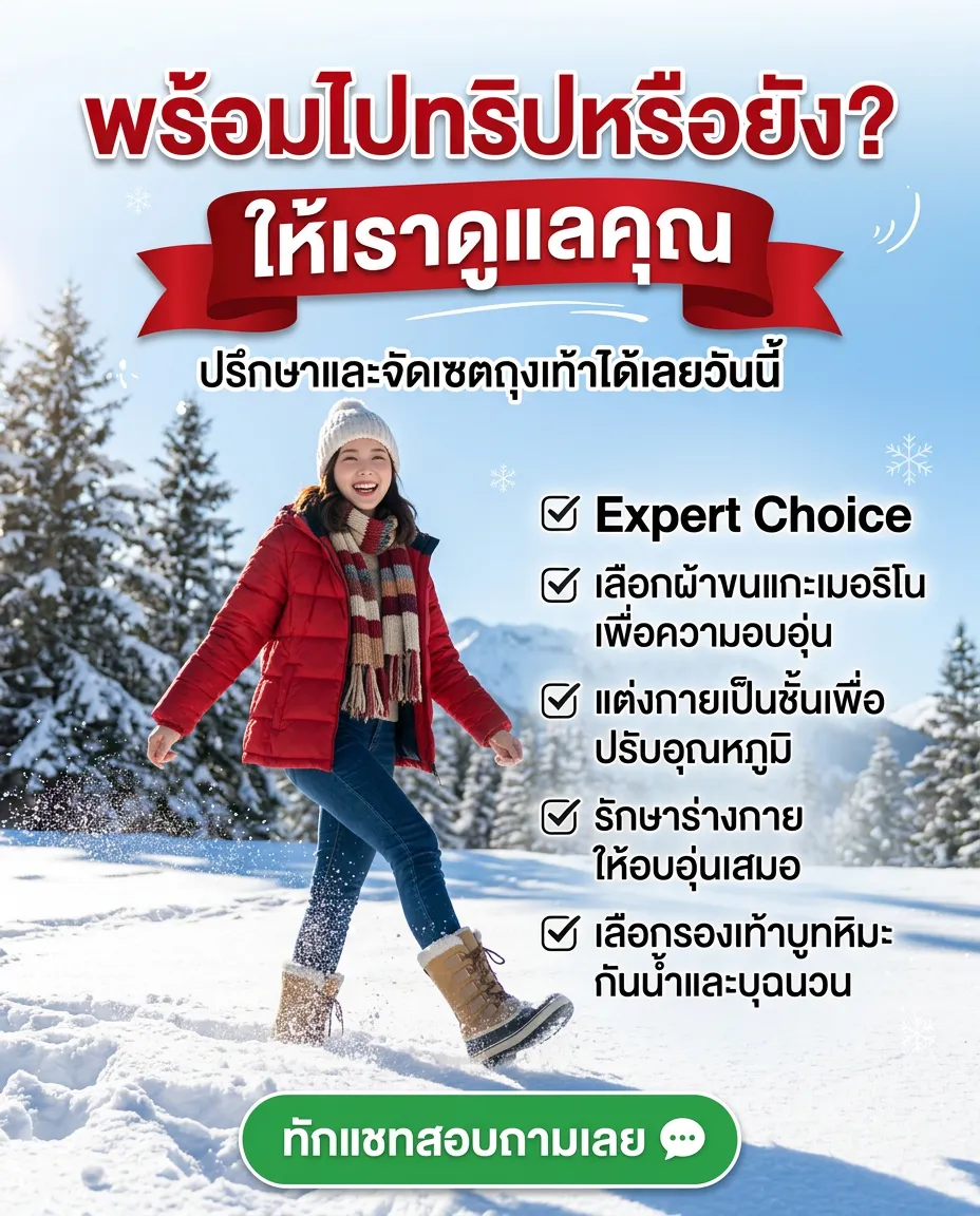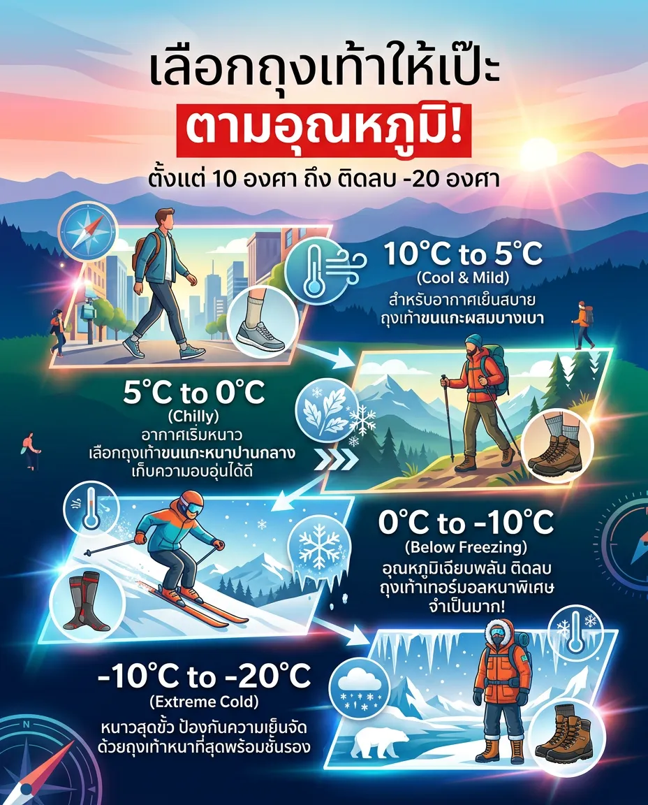 | ต่ำกว่า 0°C (ลานสกี) | เล่นสกี, สโนว์บอร์ด, กิจกรรมลุยหิมะหนัก ๆ | ถุงเท้าขนสัตว์ (Wool / Alpaca) | ทรงยาวถึงใต้เข่า (Over-the-calf) เพื่อป้องกันการเสียดสีจากรองเท้าสกี |
