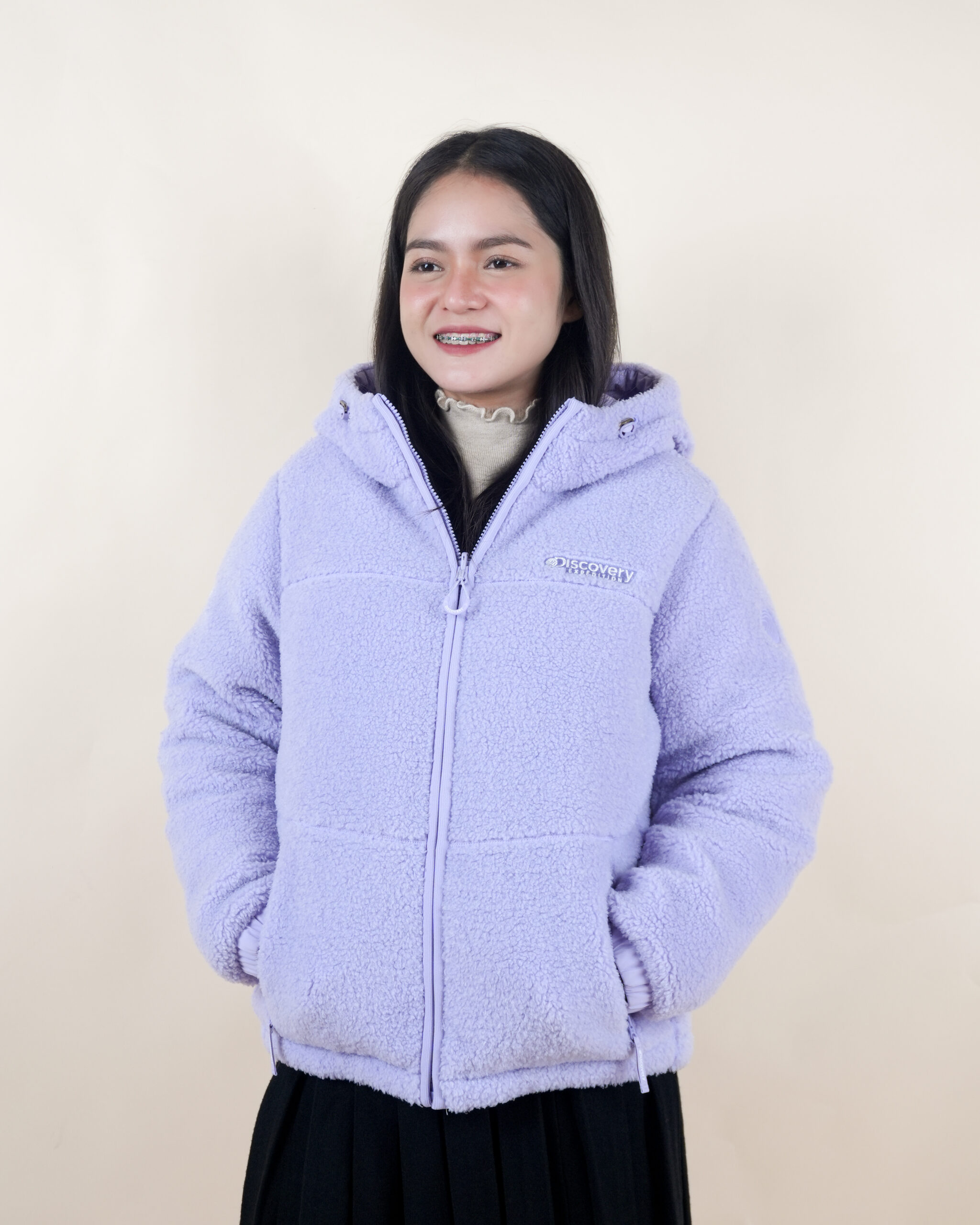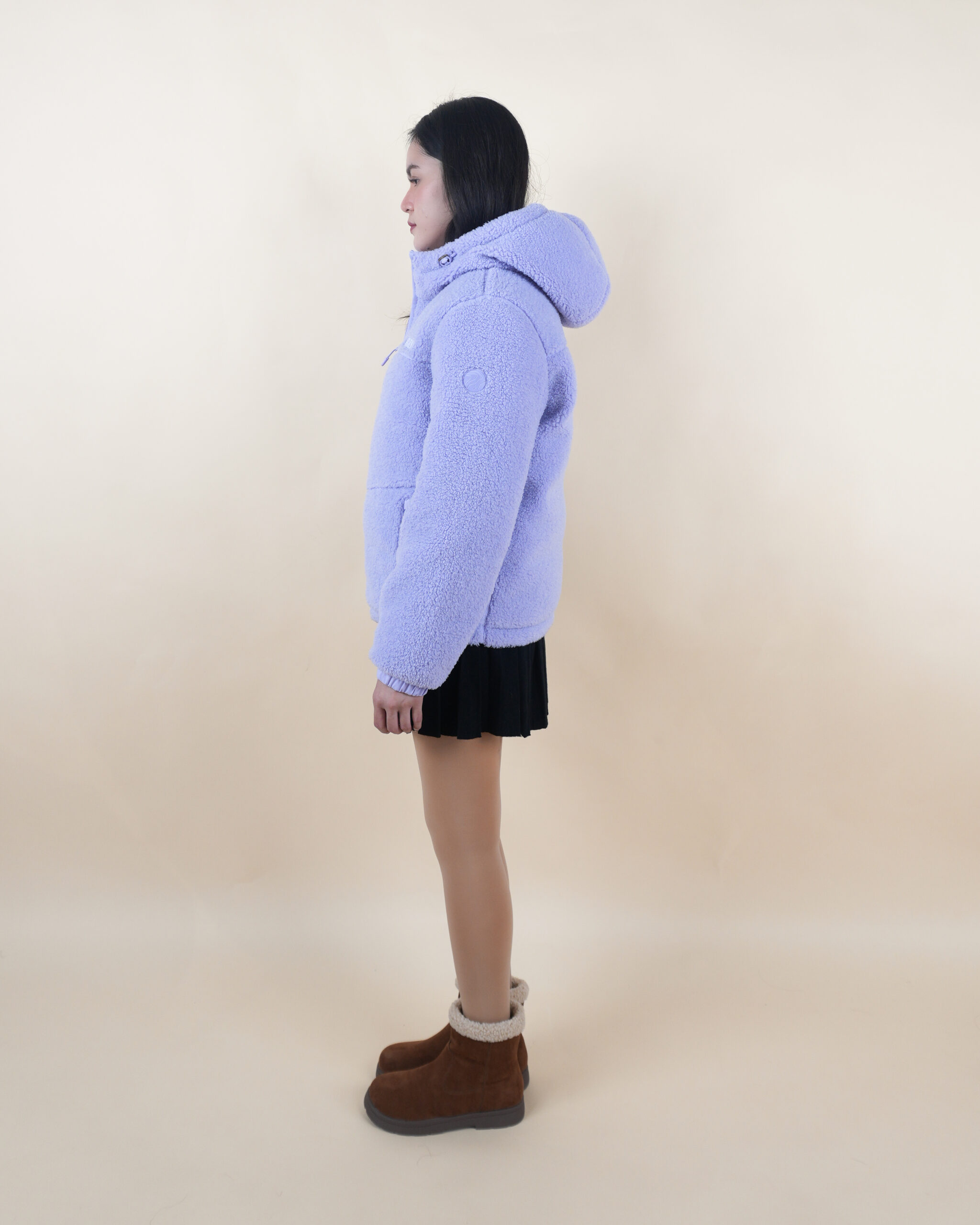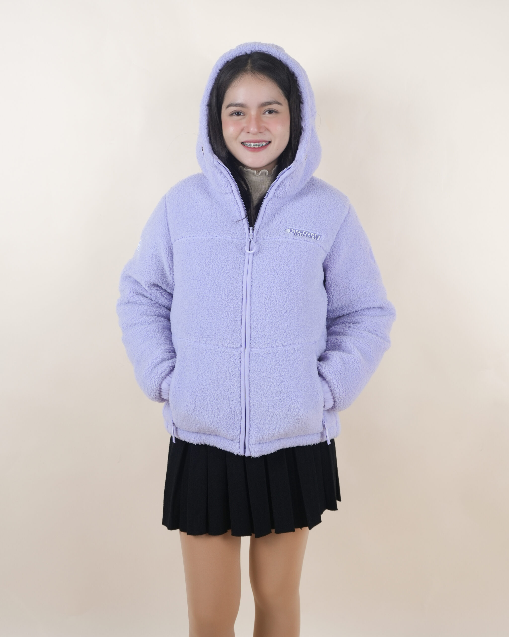 เสื้อขนห่านสีม่วงพาสเทลใส่ได้สองด้าน มีฮู้ด