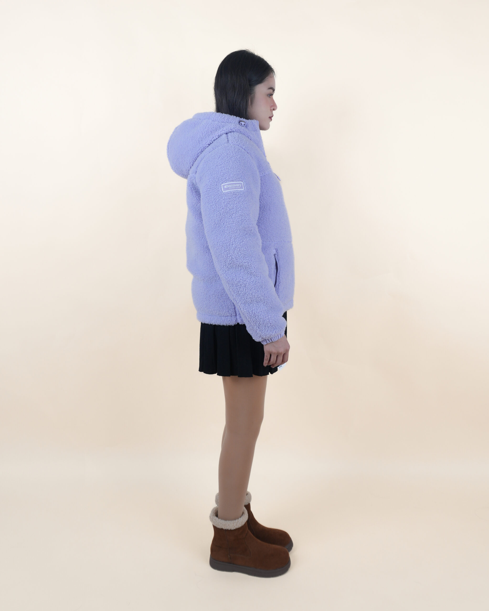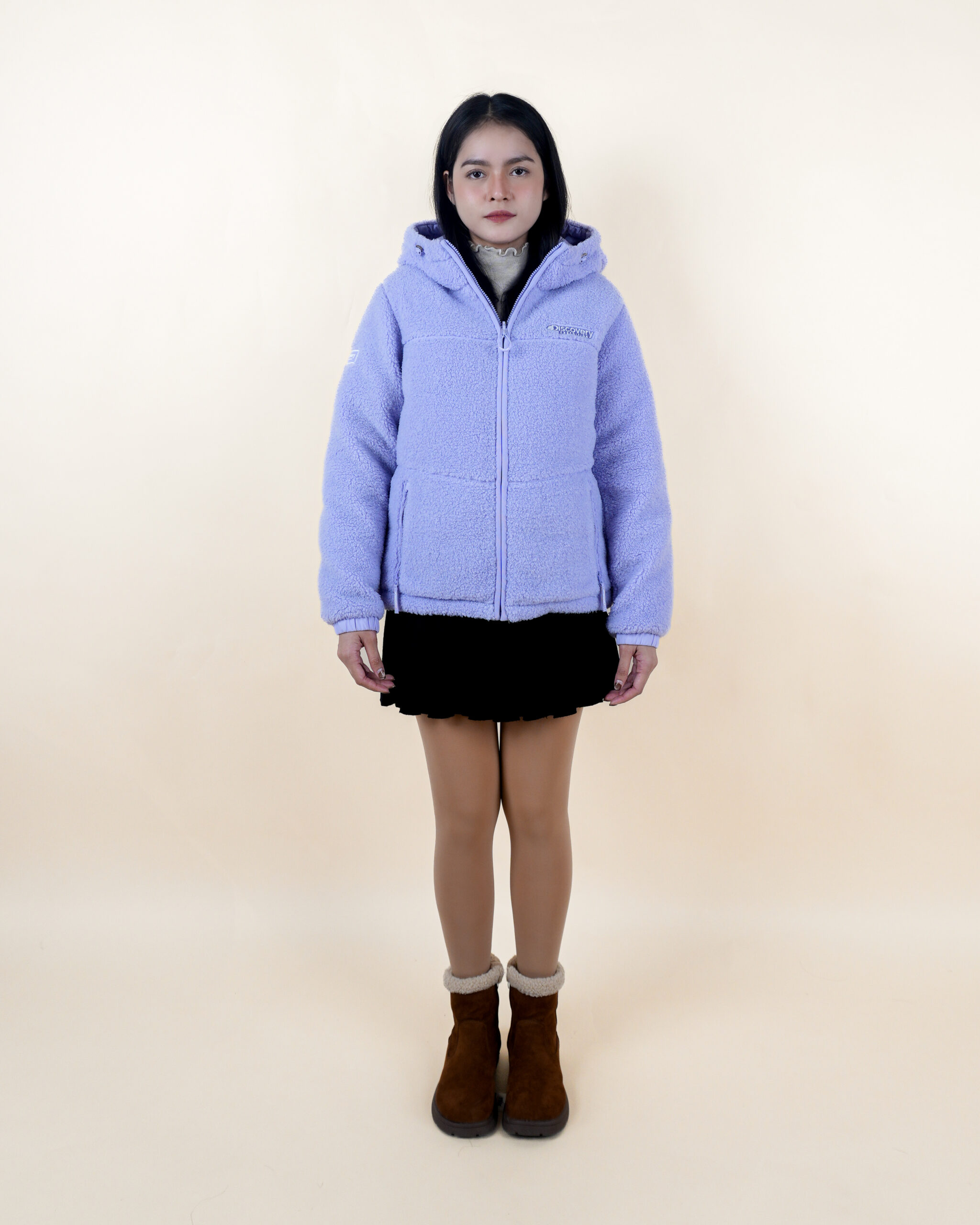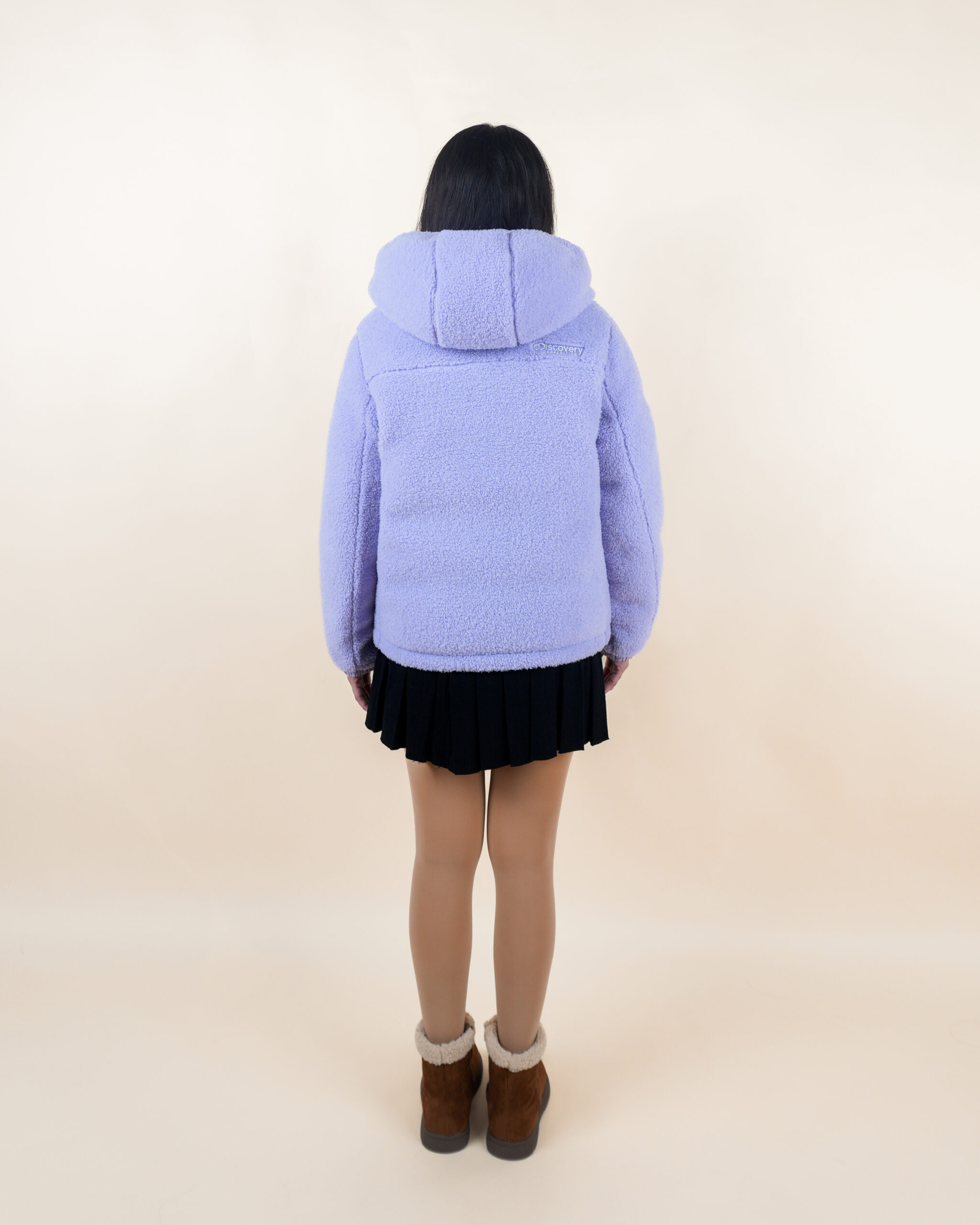 เสื้อขนห่านสีม่วงพาสเทลใส่ได้สองด้าน มีฮู้ด