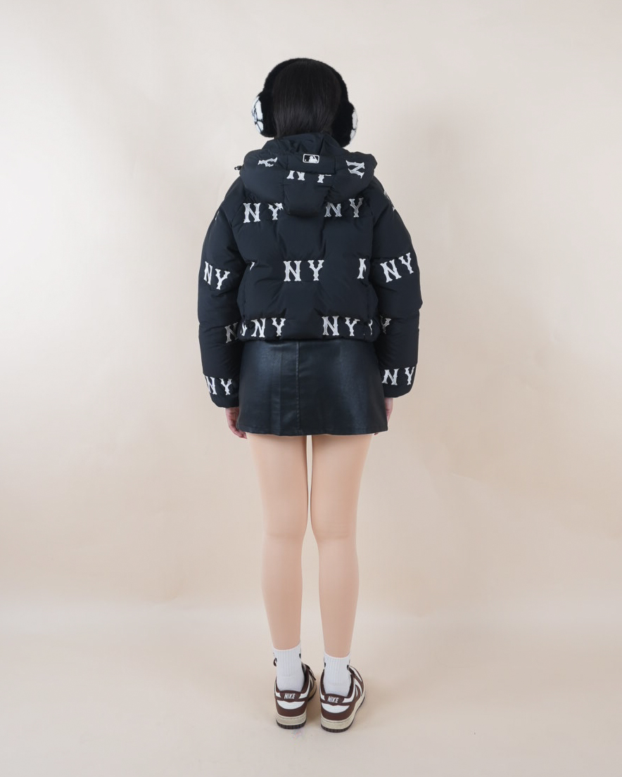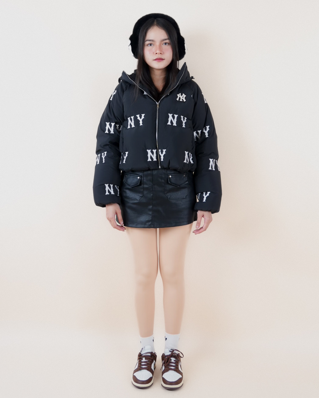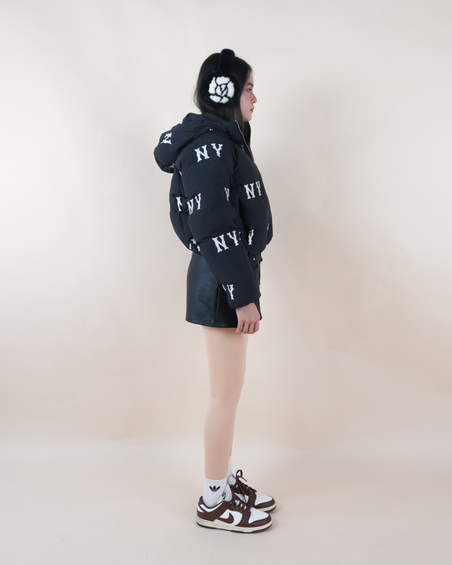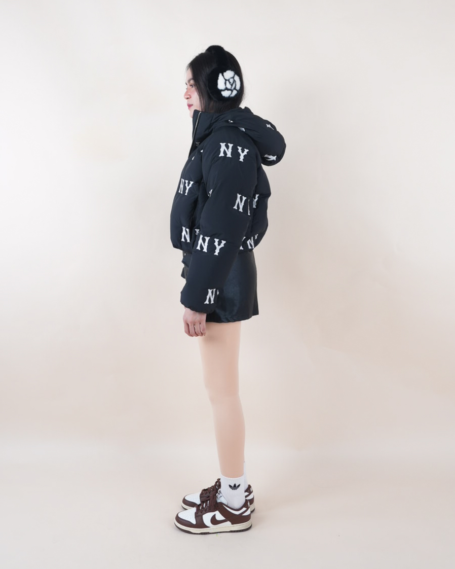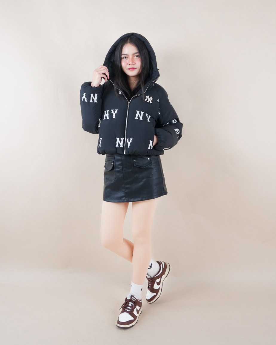 เสื้อแจ็กเก็ททรงครอปสีดำมีฮู้ดสกรีนลายNY