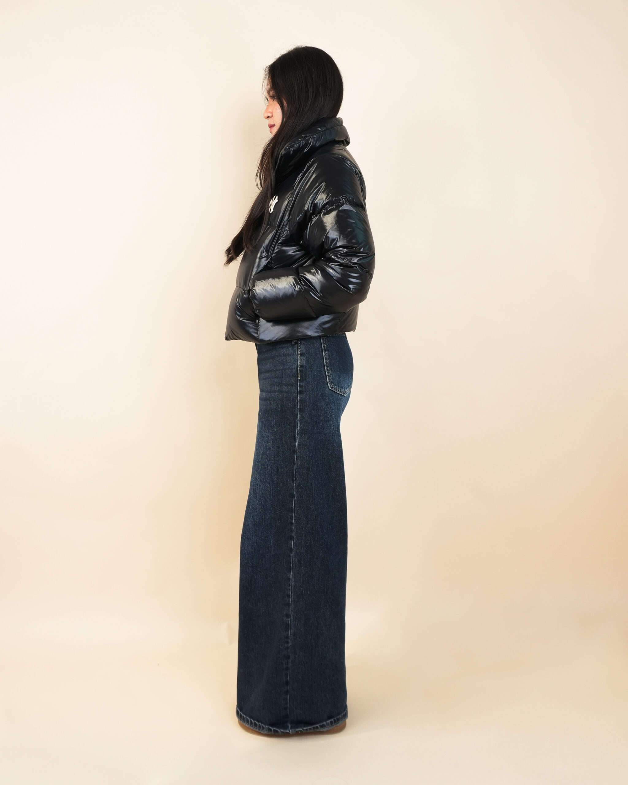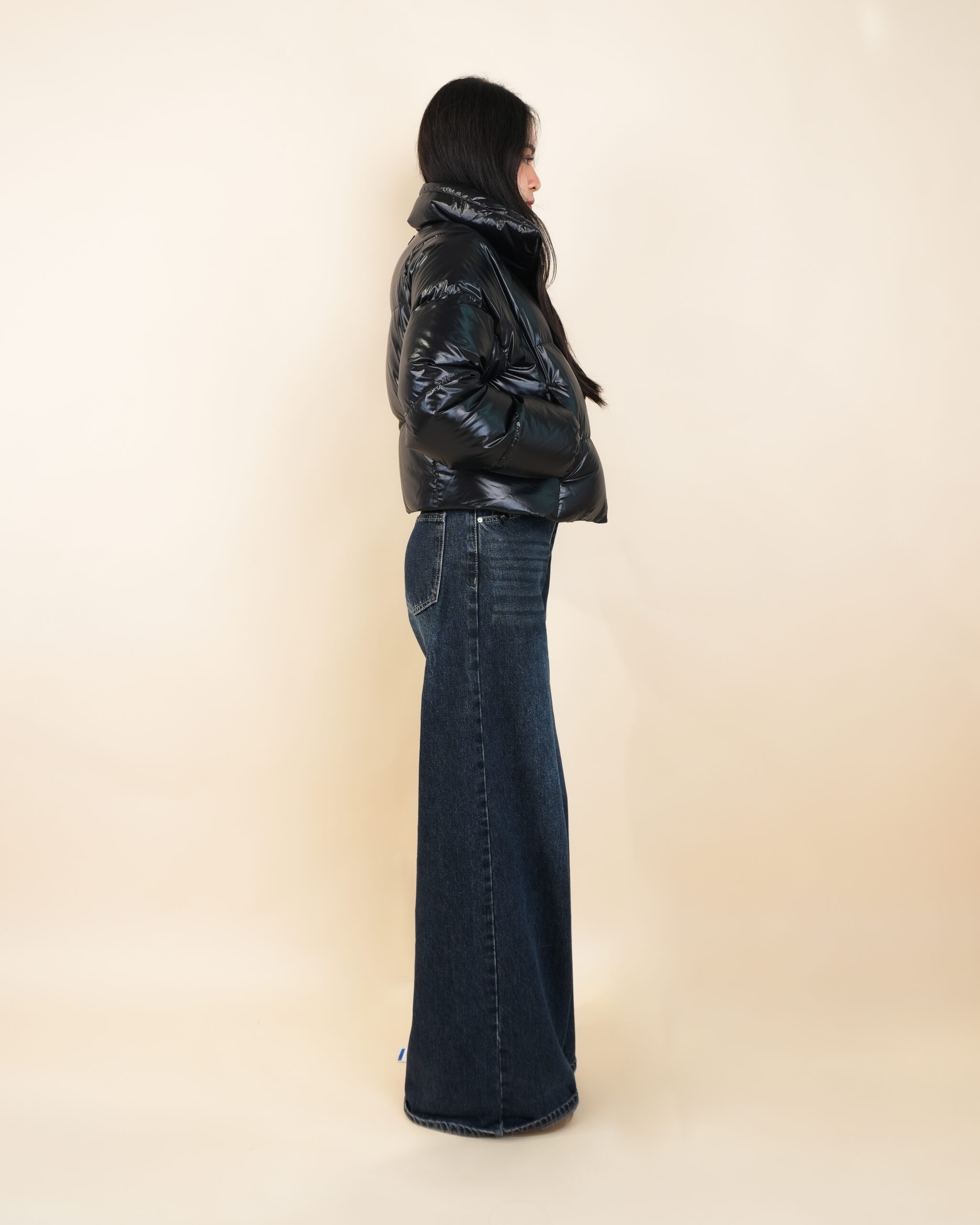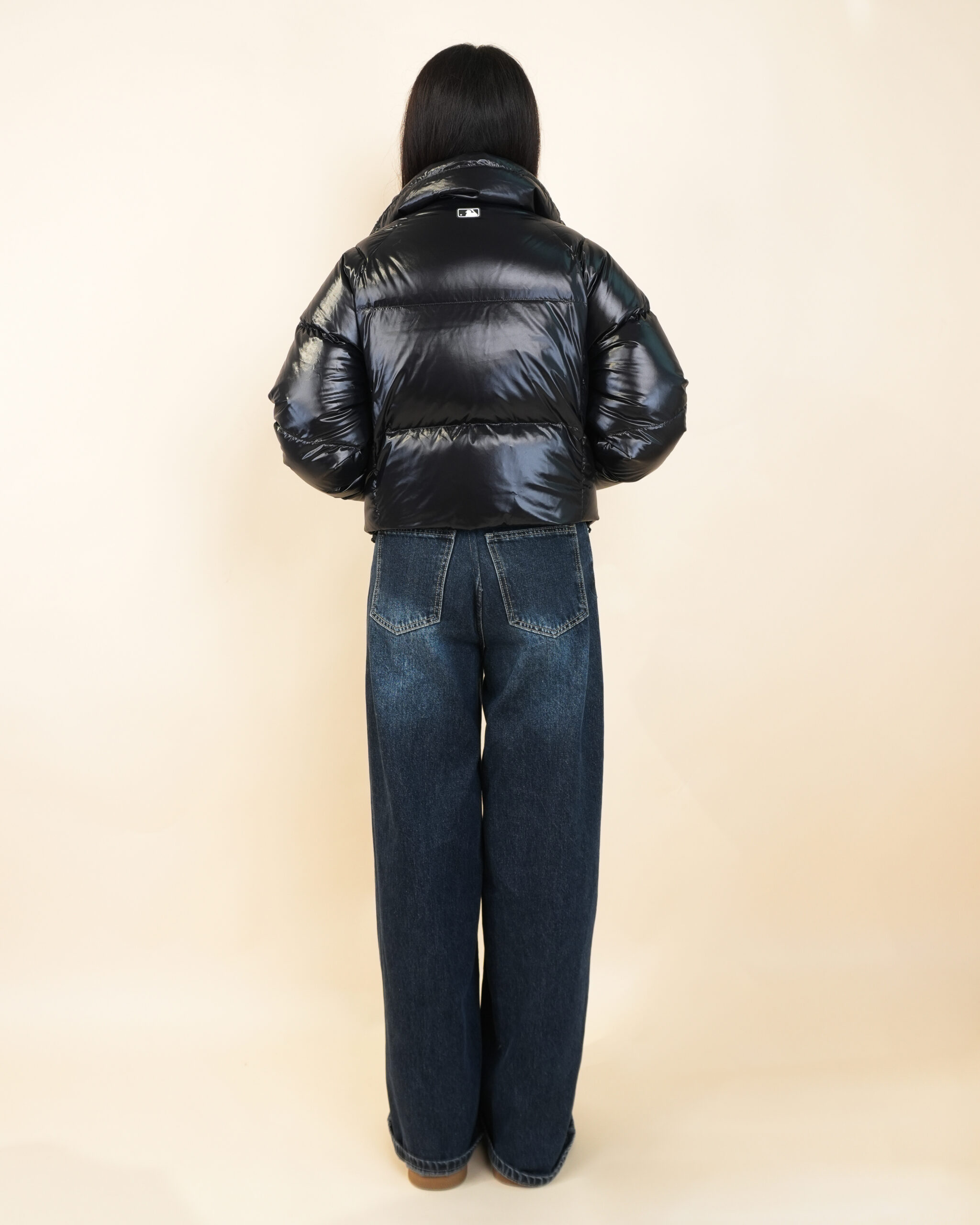 ML เสื้อขนเป็ดสีดำเอวปรับรูดทรงครอป