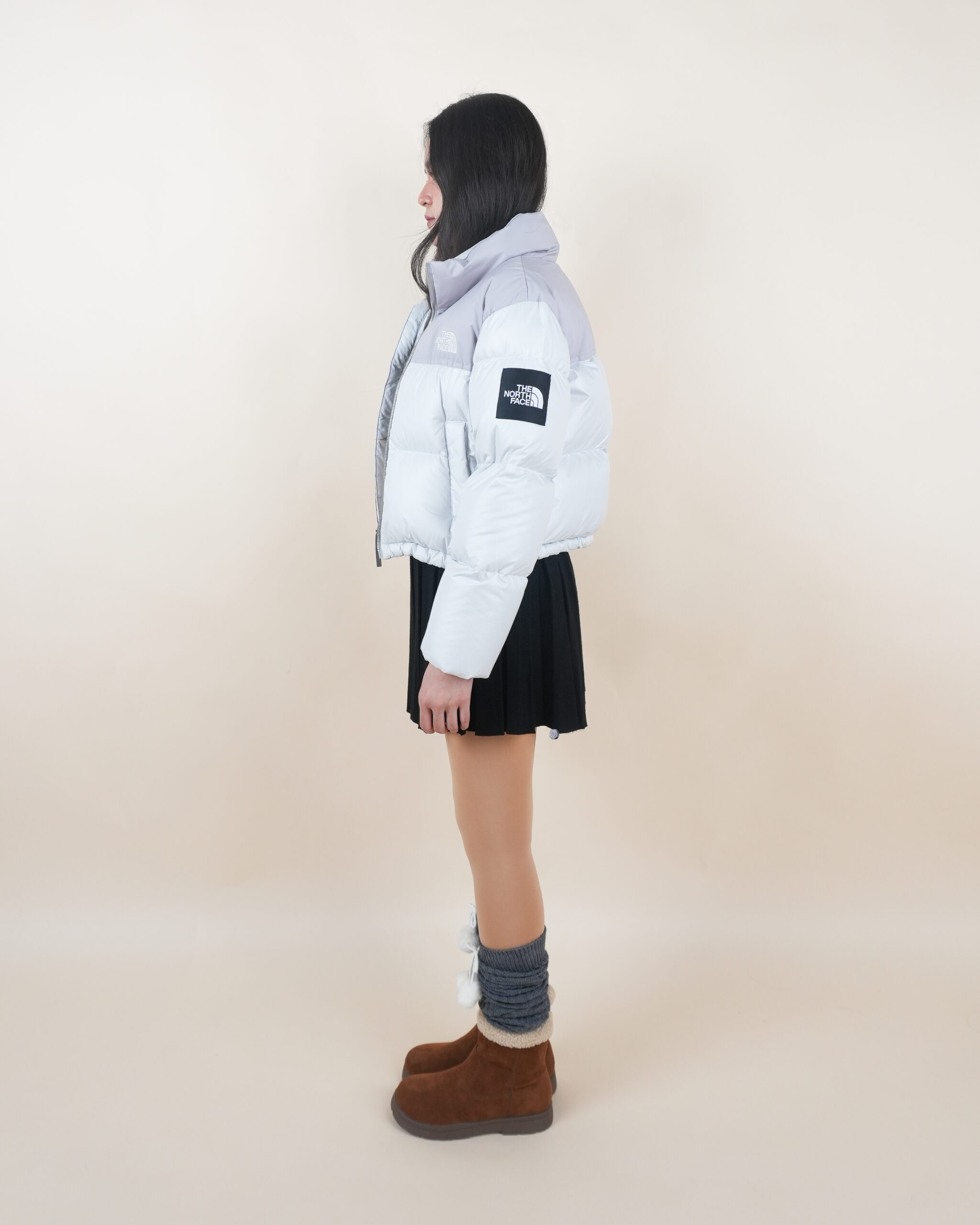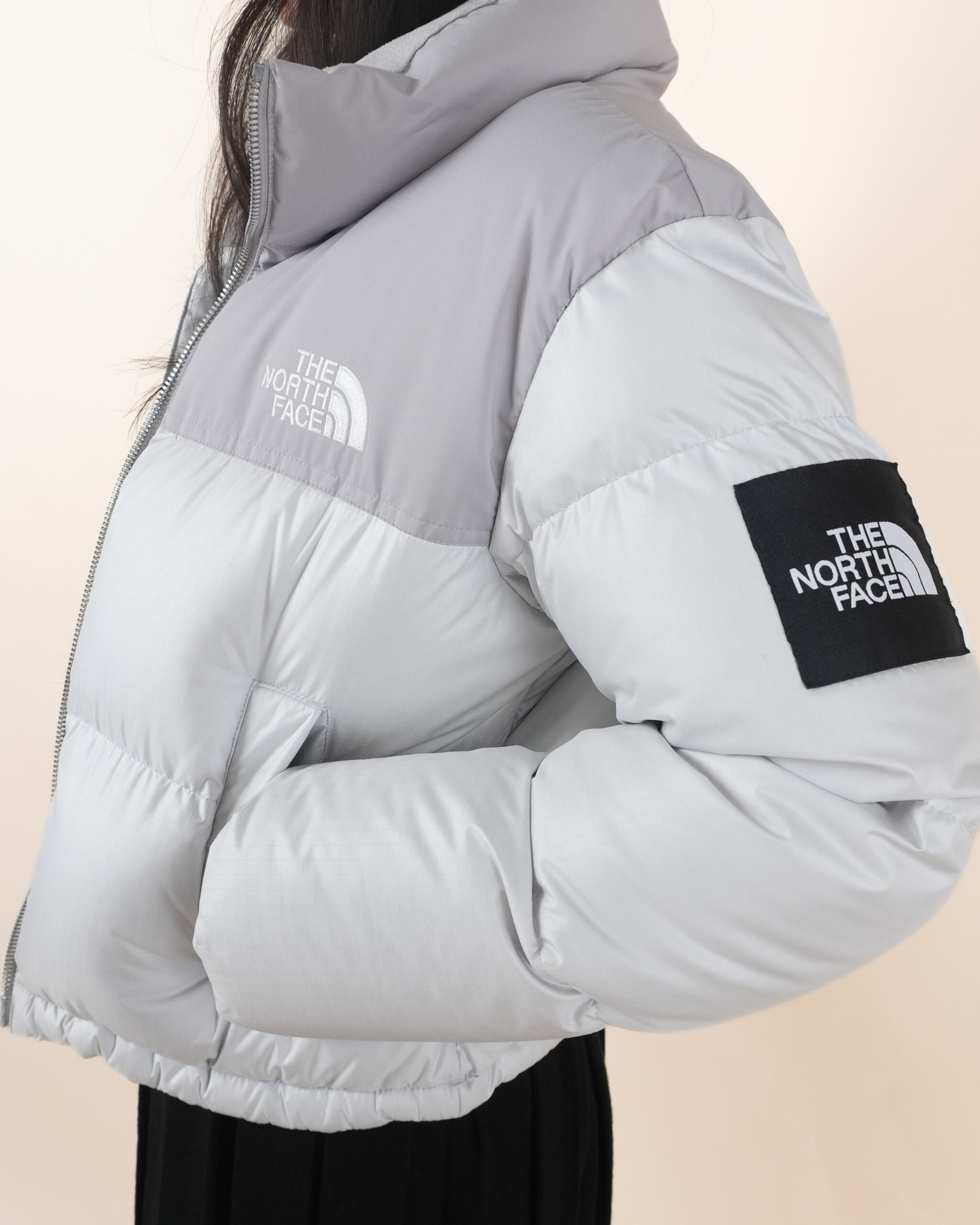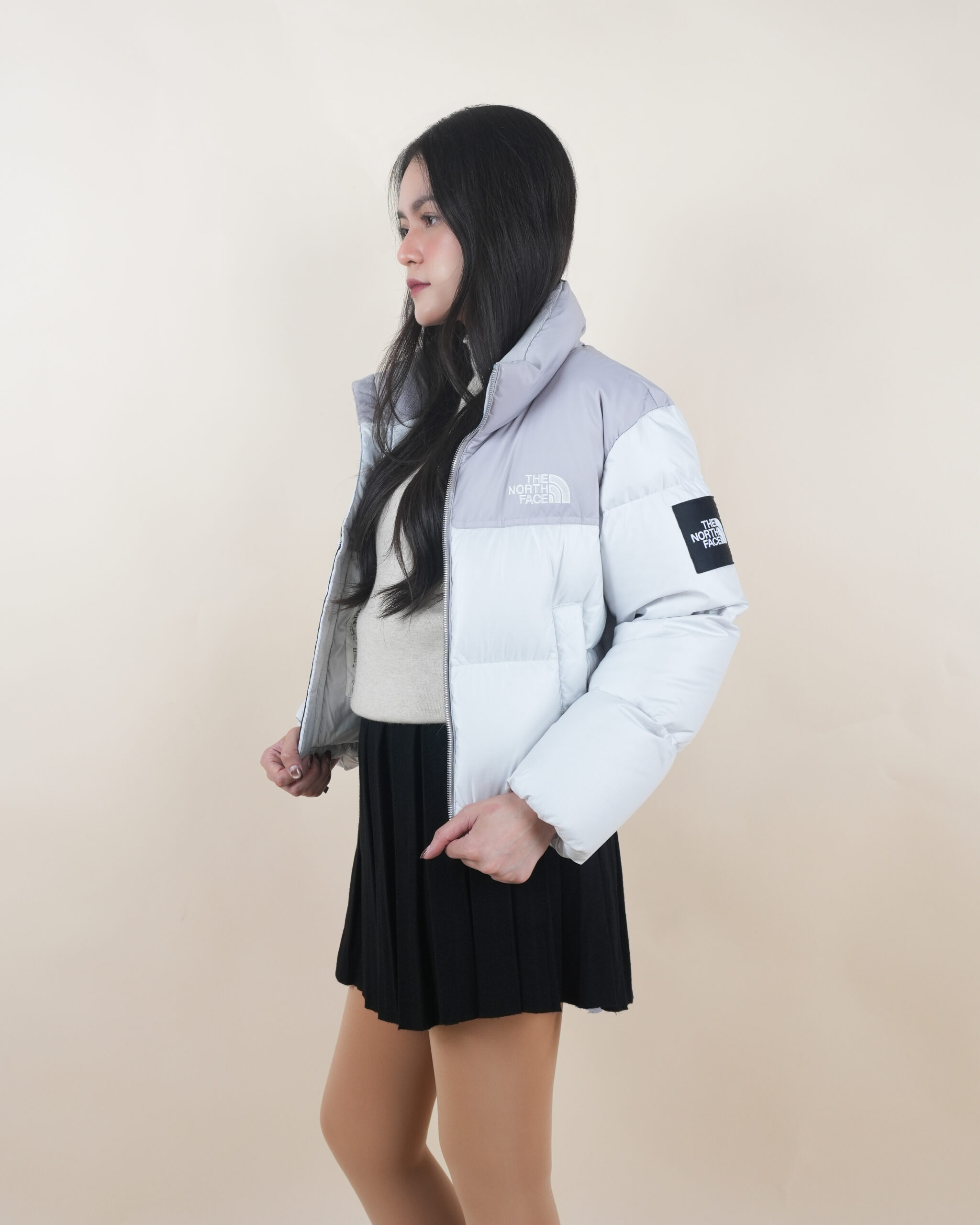 NF เสื้อขนเป็ดสีขาวไหล่เทาปักโลโก้อกซ้ายแขนซ้ายทรงครอป