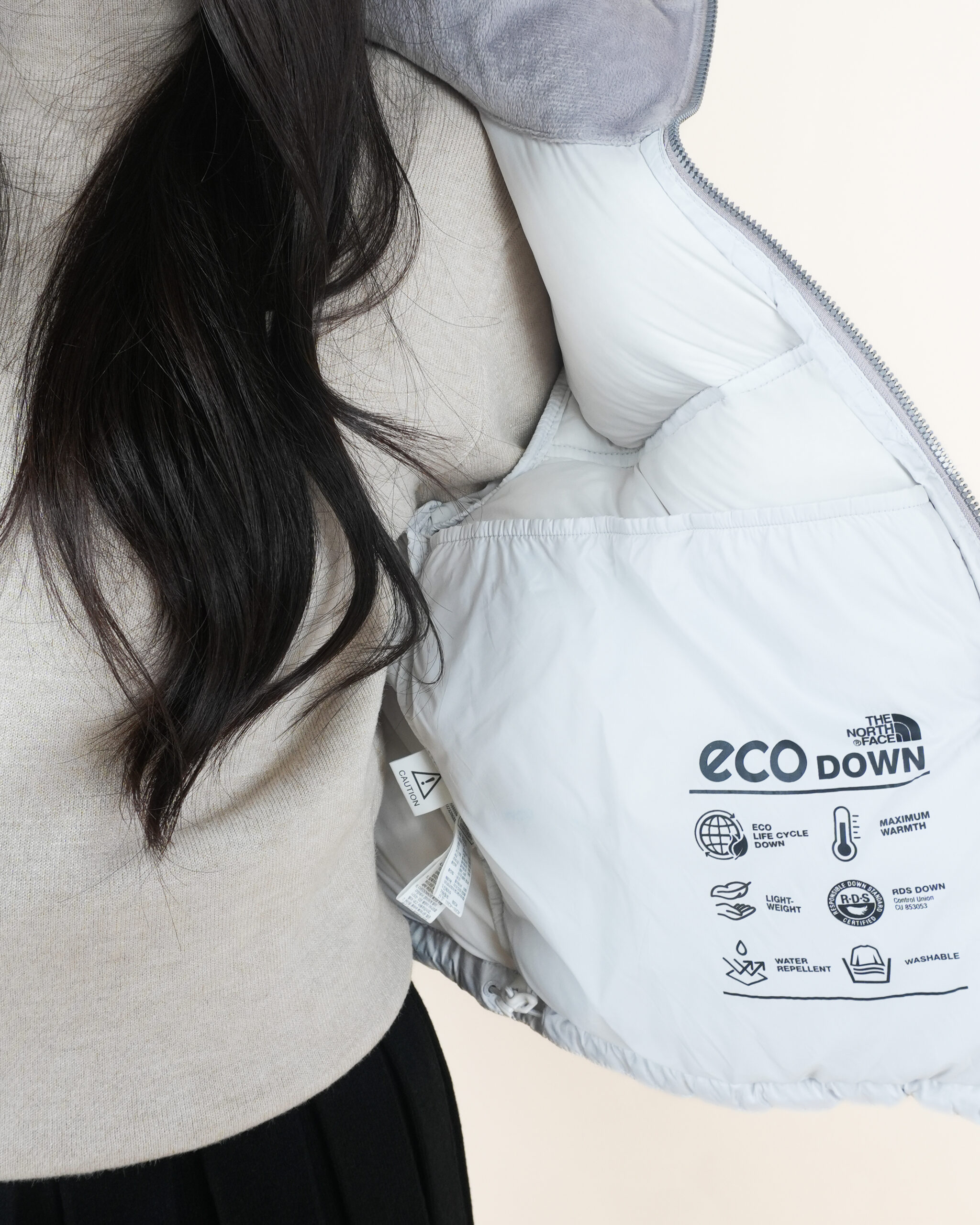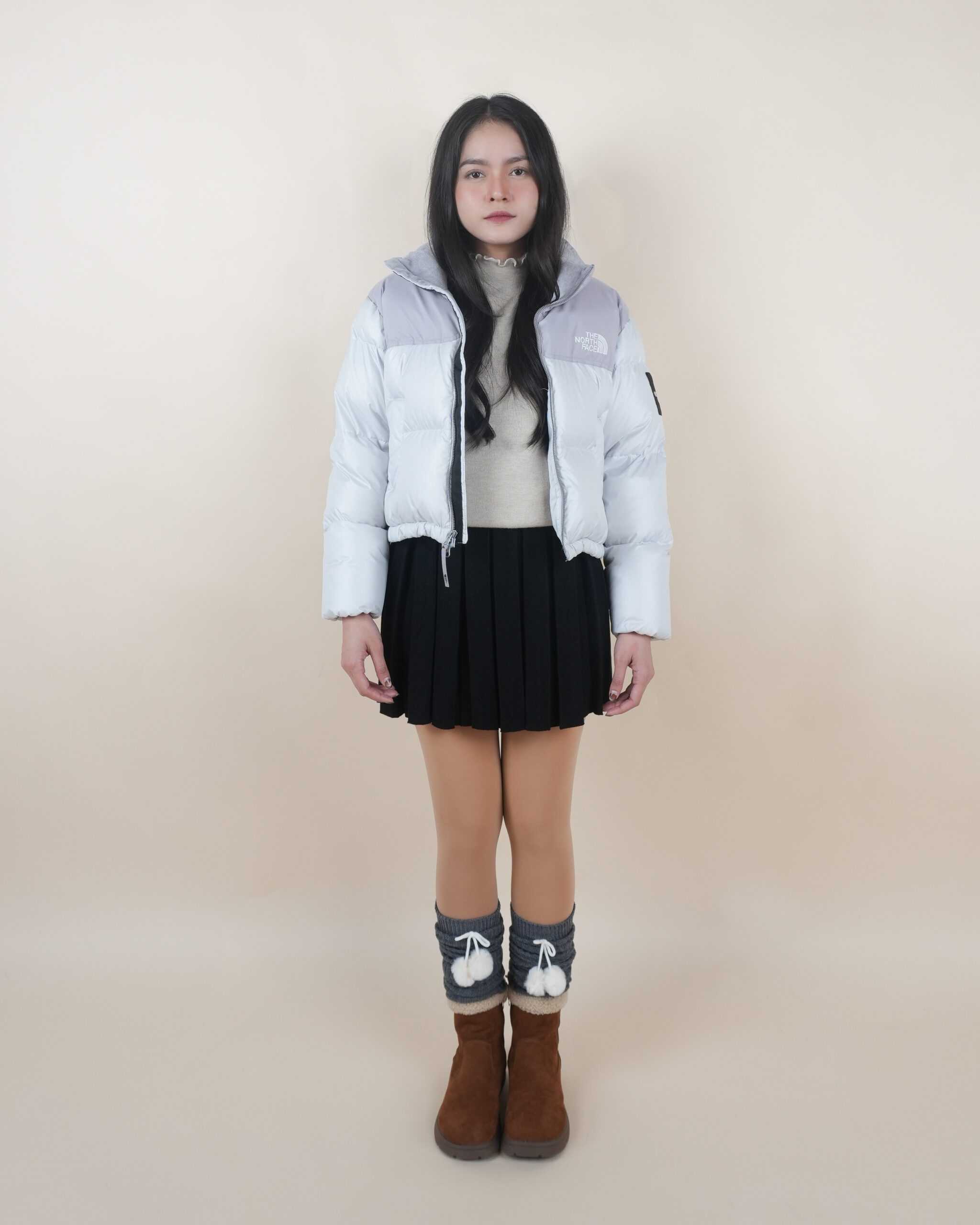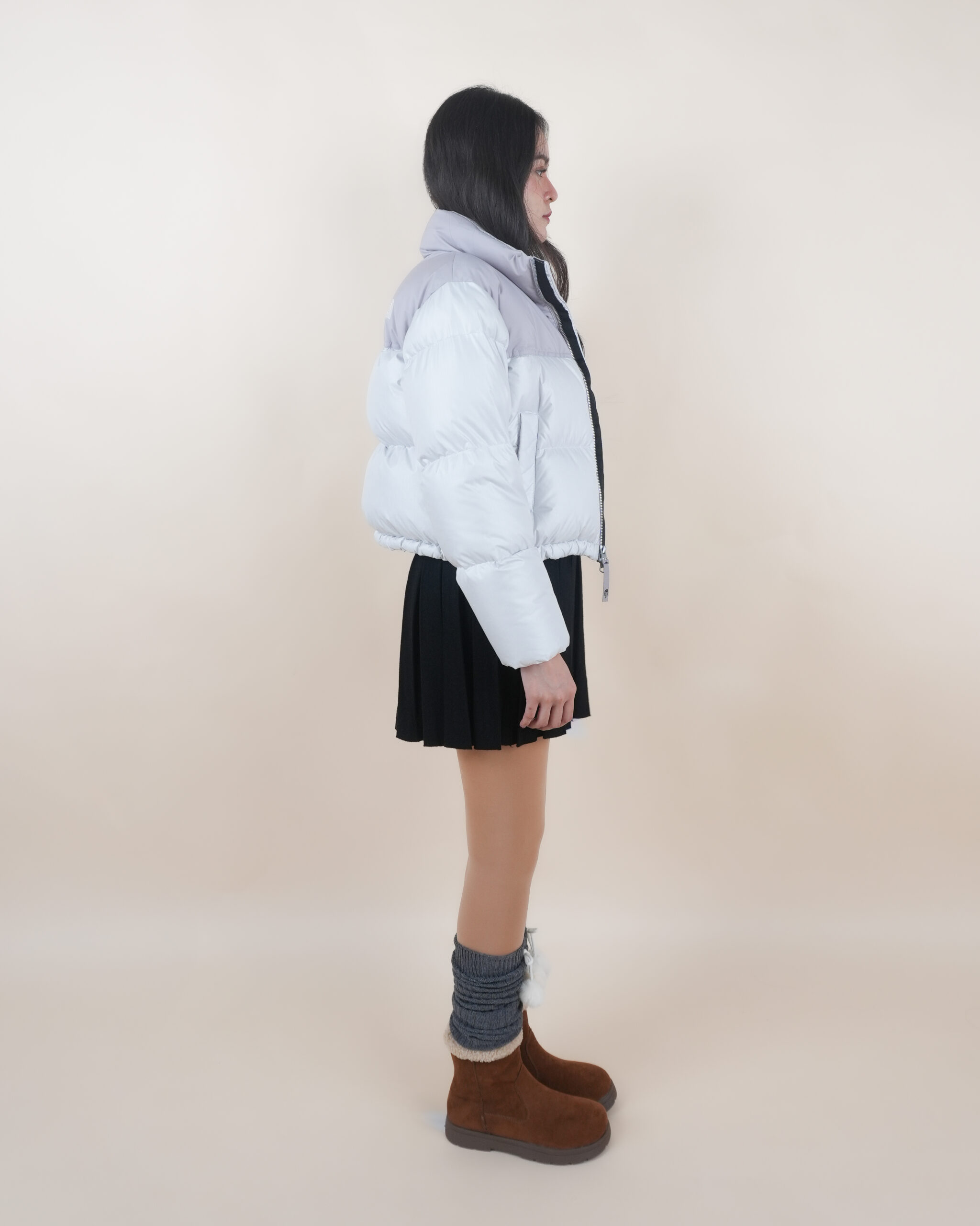 NF เสื้อขนเป็ดสีขาวไหล่เทาปักโลโก้อกซ้ายแขนซ้ายทรงครอป
