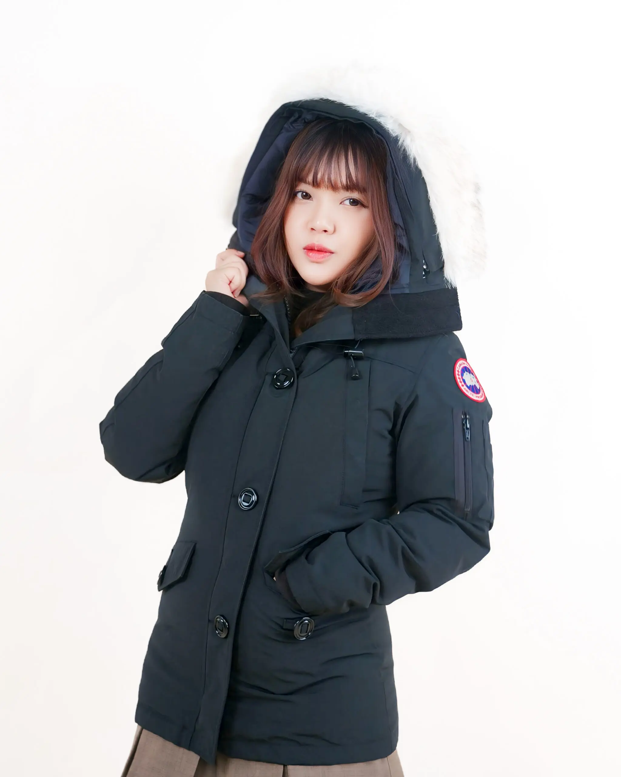 CG เสื้อขนห่านสีดำตัวยาวฮู้ดเฟอร์กระดุมใหญ่